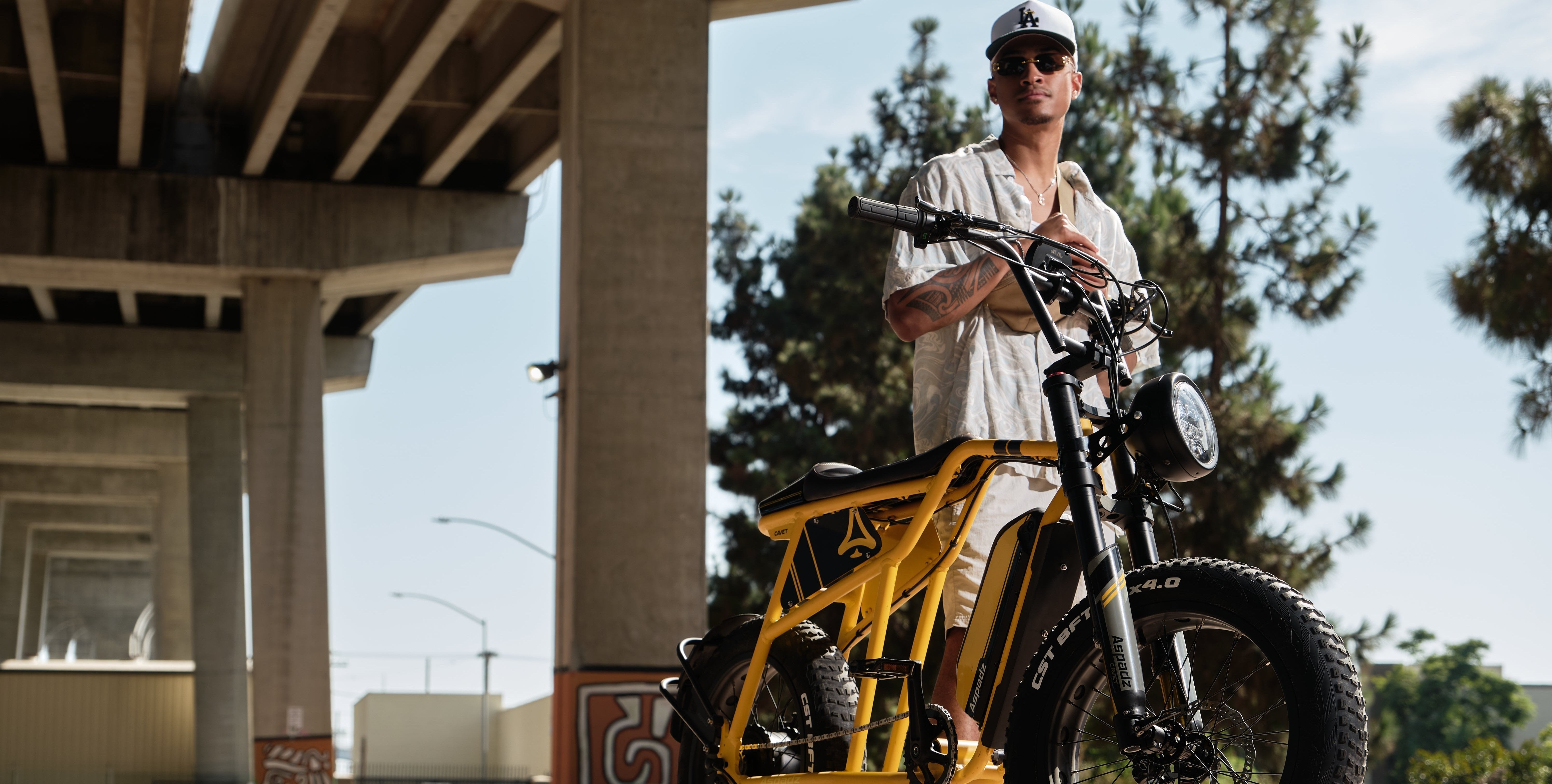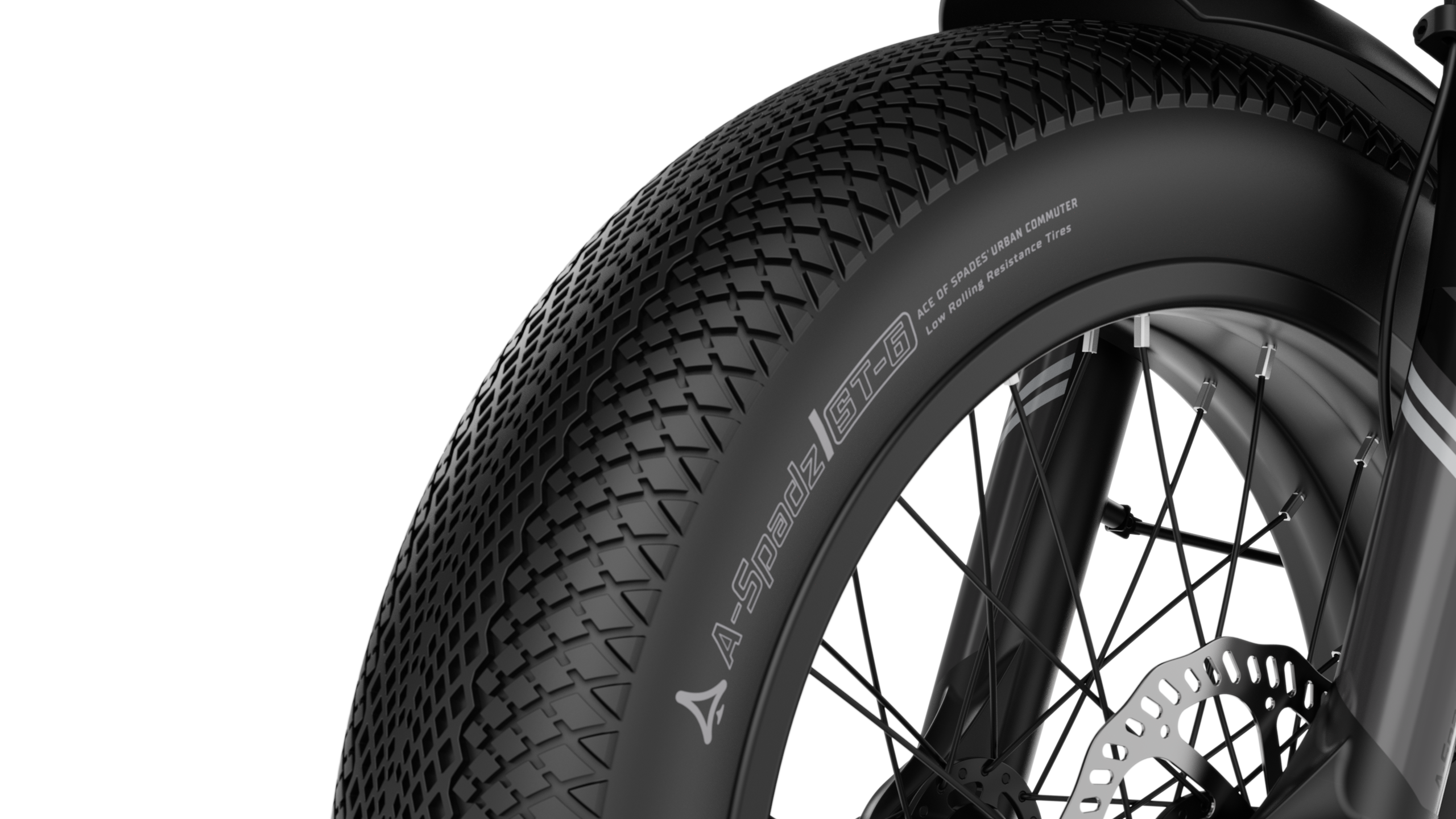 20*4.0 e-moped fat tires that blend moto and bicycle tire construction for improved traction, reduced road noise and increased stablity.