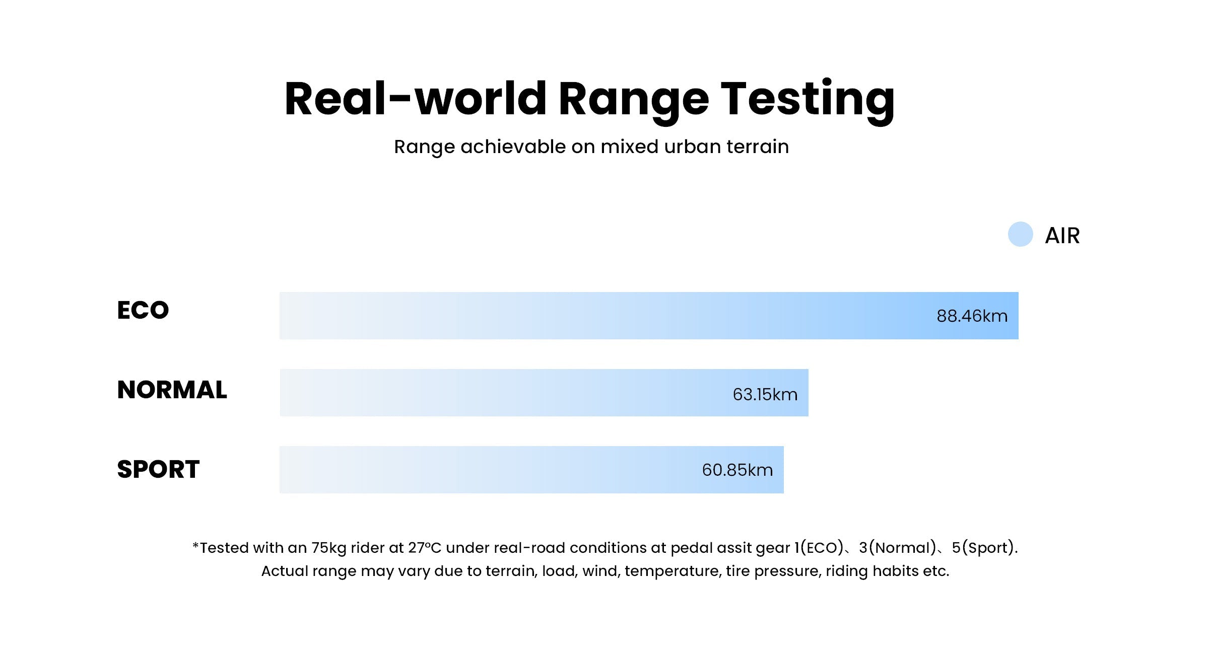 Eco-Save power, ride longer.Tour-Easy cruising through the city.Normal-Just right for daily commutes.Sport-A little boost for a faster ride.Turbo-Full power, city feels smaller.